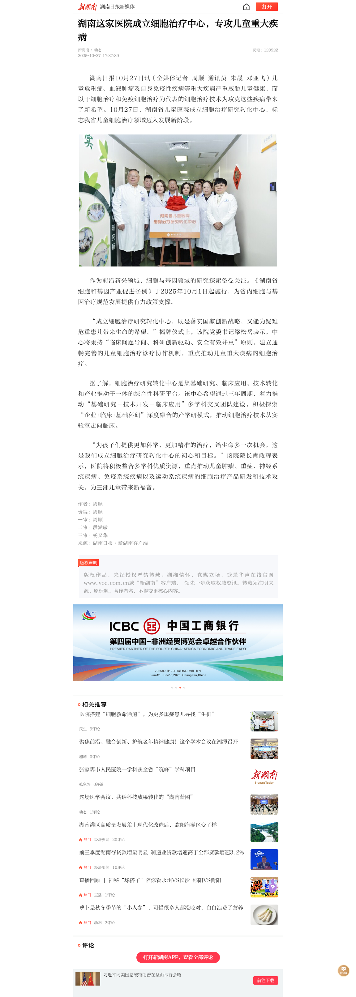 “为孩子们提供更加科学、更加精准的治疗,给生命多一次机会,这是我们成立细胞治疗研究转化中心的初心和目标。”该院院长肖政辉表示,医院将积极整合多学科优质资源,重点推动儿童肿瘤、重症、神经系统疾病、免疫系统疾病以及运动系统疾病的细胞治疗产品研发和技术攻关,为三湘儿童带来新福音。