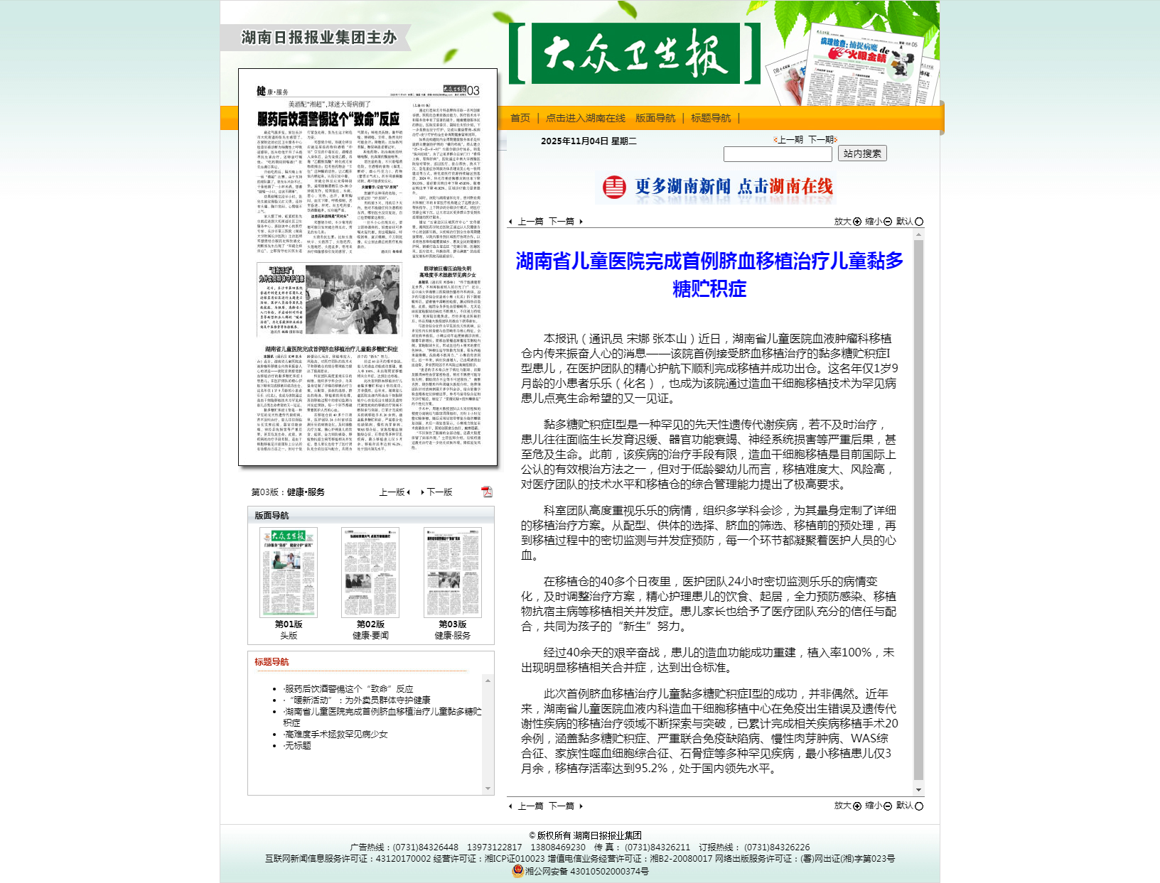 此次首例脐血移植治疗儿童黏多糖贮积症I型的成功,并非偶然。近年来,湖南省儿童医院血液内科造血干细胞移植中心在免疫出生错误及遗传代谢性疾病的移植治疗领域不断探索与突破,已累计完成相关疾病移植手术20余例,涵盖黏多糖贮积症、严重联合免疫缺陷病、慢性肉芽肿病、WAS综合征、家族性噬血细胞综合征、石骨症等多种罕见疾病,最小移植患儿仅3月余,移植存活率达到95.2%,处于国内领先水平。