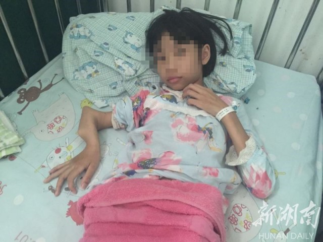 8月30日下午,记者在省儿童医院皮肤科病房里见到了12岁的婉婉,躺在病床上,身形十分消瘦。由于患病,右手已经出现了严重的畸形,整个手臂已经出现短缩,肘关节也肿胀变形。