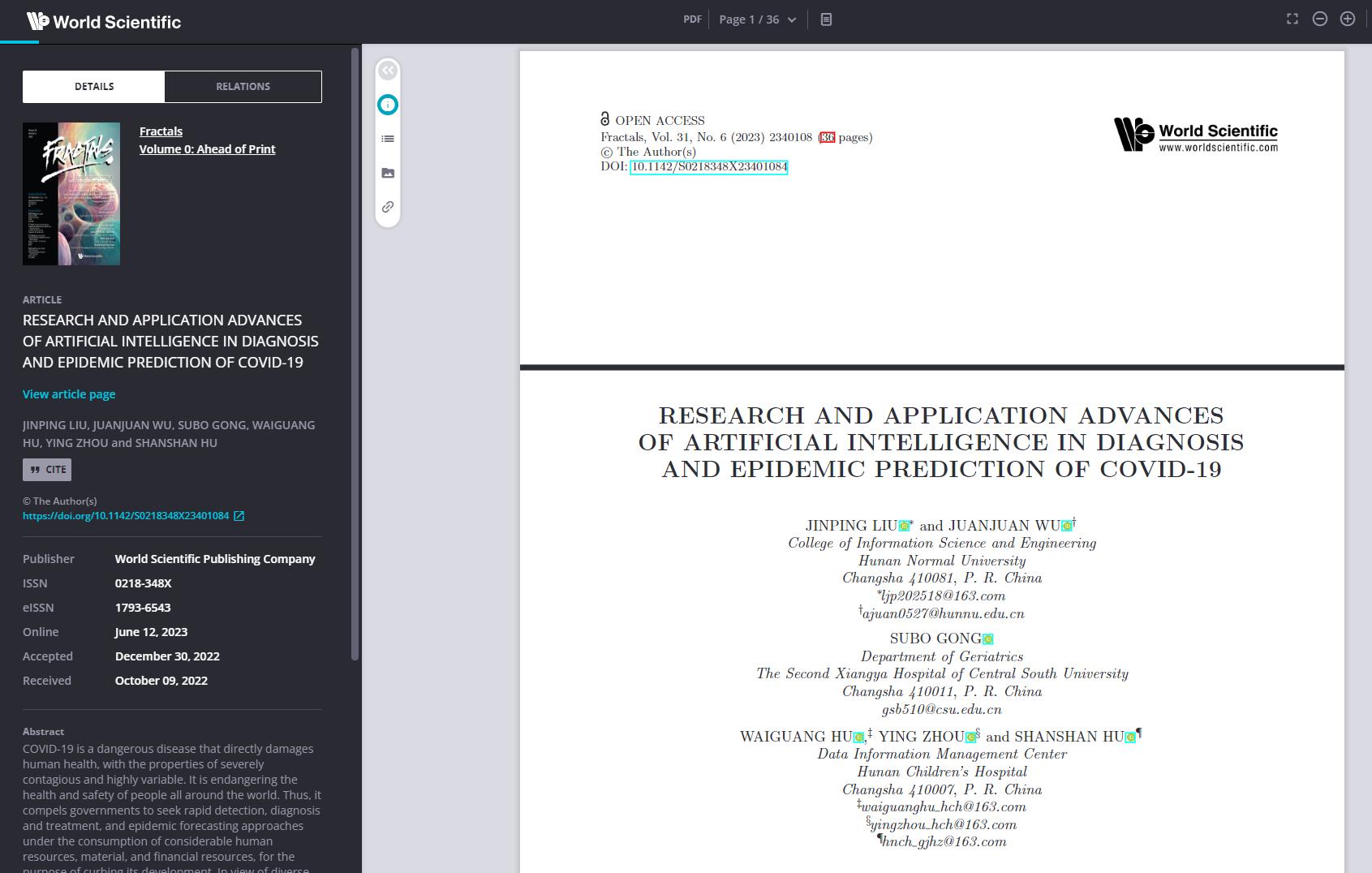 近日,湖南省儿童医院数据信息管理中心与湖南省师范大学刘金平教授团队合作研究成果“RESEARCH AND APPLICATION ADVANCES OF ARTIFICIAL INTELLIGENCE IN DIAGNOSIS AND EPIDEMIC PREDICTION OF COVID-19(人工智能在新冠肺炎诊断和流行预测中的研究与应用进展)”为题,以研究长文(Research Article)形式发表在国际数学期刊《Fractals》(影响因子4.7)。胡外光为论文通讯作者,胡珊珊、周颖为论文共同作者,湖南省儿童医院为通讯作者单位。