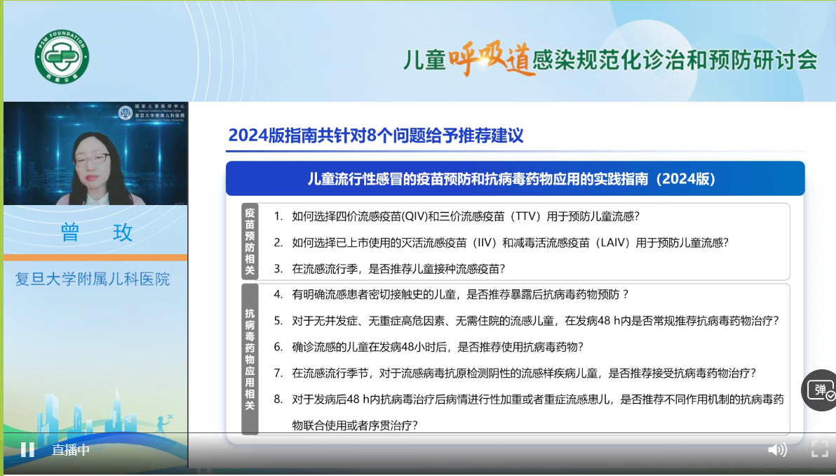 会议伊始,指南制订发起人和执笔专家,复旦大学附属儿科医院曾玫教授率先进行了《儿童流行性感冒的预防和抗病毒药物应用指南》的解读,曾玫教授表示:此部指南是我国首个在流感疫苗与抗病毒药物使用领域,应用推荐分级评价、制定与评估(GRADE)方法制作而成的指南。指南就“疫苗预防相关的3个问题,抗病毒药物应用相关的5个问题“予以推荐建议,为我国流感相关的临床实践和疫苗接种实践提供了客观、科学的依据,同时也更好地指导了儿童疫苗的接种,及抗病毒药物的治疗与预防。曾玫教授深入浅出的分享,让广大参会代表再次体悟了指南的临床价值。