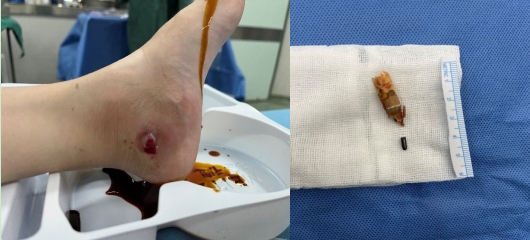 2025年3月17日,骨科创伤团队在全麻下为患儿实施"左跟骨骨髓炎病灶清理+VAC引流术+异物探查取出术"。术中发现患儿内踝窦道深部嵌有1.5mm×10mm黑色铅笔芯,铅笔芯贯穿胫后神经血管束,牵开重要血管神经后,深部另存3cm完整铅笔,其笔芯在影像学下可显影。