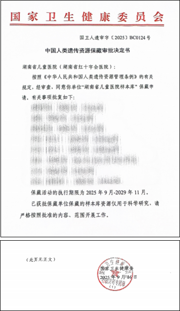 近日,国家卫健委公布了中国人类遗传资源行政许可事项2025年第17批审批结果,湖南省儿童医院生物样本库获批国家卫健委“中国人类遗传资源保藏”行政许可(批准文号:国卫人遗审字(2025)BC0124号),这标志着医院在儿童疾病生物样本资源规范化、标准化和合法化建设方面达到国家权威标准,也为科研创新、临床转化及区域医疗协同发展提供了重要支撑。