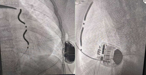 10月29日上午,心胸外科邓喜成主任医师、心血管内科王野峰副主任医师、左超主治医师、麻醉科专家肖婷主任医师等专家协同合作,为患者实施EV-ICD植入手术。术中通过胸骨下方微小切口,团队将专用血管外除颤导线精准植入胸骨后间隙,并与埋置于左侧腋下的除颤器主机相连接。该导线系统完全避开心脏和血管,借助胸骨后贴近心脏的解剖位置,实现了对心律失常的监测与治疗功能。术中按标准程序进行了严格的系统测试,通过程序电刺激诱发出持续性室性心动过速,EV-ICD系统即刻准确识别并成功实施转复治疗。测试数据显示,该系统心律失常识别灵敏度达100%,除颤效能与经典经静脉ICD相当,各项参数完全符合临床预期。