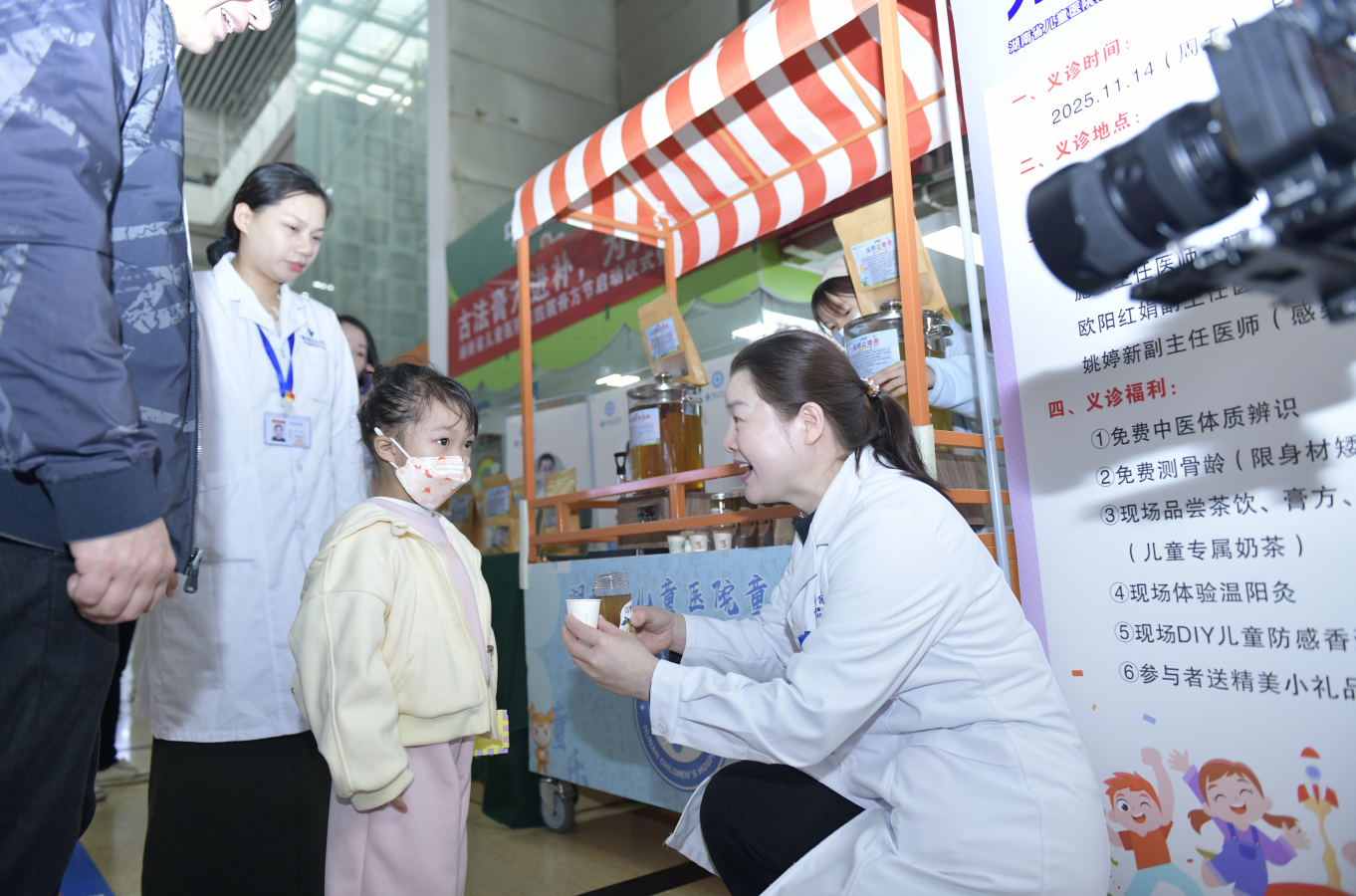 本次活动邀请到呼吸内科施弦主任医师、消化营养科欧阳红娟副主任医师、感染科姚婷新副主任医师为就诊患儿提供免费咨询和指导,现场准备了膏方、茶饮、儿童专属奶茶供大家品尝,同时还开展免费中医体质辨识、免费测骨龄、儿童防感香囊DIY、赠送精美小礼品等活动。