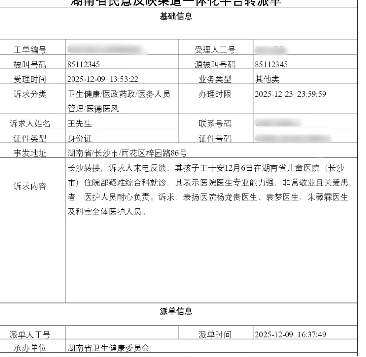 湖南省儿童医院疑难综合病房主任罗海燕表示,此次收到12345的表扬,是对医护人员工作的肯定,更是一种鞭策。科室将继续秉承“以患者为中心”的服务理念,不断提升医疗技术水平,推动中西医优势互补,为广大患儿提供更加优质、高效、温暖的医疗服务。