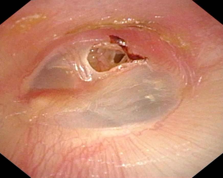 11岁的男孩小雨,马上就要期末考试了,妈妈为了他的期末考试而焦虑担忧。1月19日晚,小雨和妈妈又因为学习发生争吵,小雨妈妈气急之下,扇了小雨耳部一巴掌,当时小雨顿感右耳疼痛,事后虽有缓解但仍觉耳朵闷闷的,小雨妈妈气消后也后悔不已。1月20日早小雨起床后仍觉得右耳闷闷的,如同进水了一般,偶尔还伴随着嗡嗡地声音,小雨妈妈遂赶快带他来湖南省儿童医院就诊,耳鼻咽喉头颈外科吴雄辉主任医师在了解病史后,立即为小雨行耳纤维内镜检查,检查结果示:右侧鼓膜表面稍充血,紧张部前下象限可见穿孔。