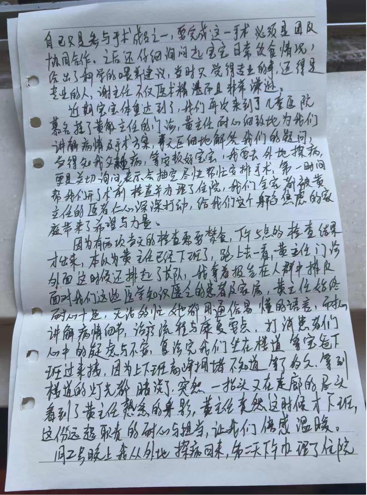 一月多前宝宝体重达到了,慕名挂了黄敏教授的门诊,黄敏耐心细致地为他们讲解病及手术方案,并不厌其烦的解答他们的疑问,当黄医师得知宝宝爷爷也生病了,爸爸需要去外地探病,更是不停安慰,并在第一时间为宝宝开好了术前检查,结果到下午下班时才出来,家长以为赶不上黄主教授看结果,没想到她的诊室门口还排着很长的队,家长发现黄教授无论多忙,她对每位病人家长都用通俗易懂的语言,耐心讲解病情细节,治疗流程与康复要点,打消了家长们心中的疑虑与不安。小晴晴的妈妈听完黄主任解读检查结果后,带着孩子坐在楼道等宝爸下班过来接,等了很久,等到楼道的灯光都暗淡了,家长抬头时忽然在楼道的远端发现黄教授的背影。宝宝全家都被黄敏主任的敬业与温暖深深打动,给这个焦虑的家庭带来了希望与力量。
