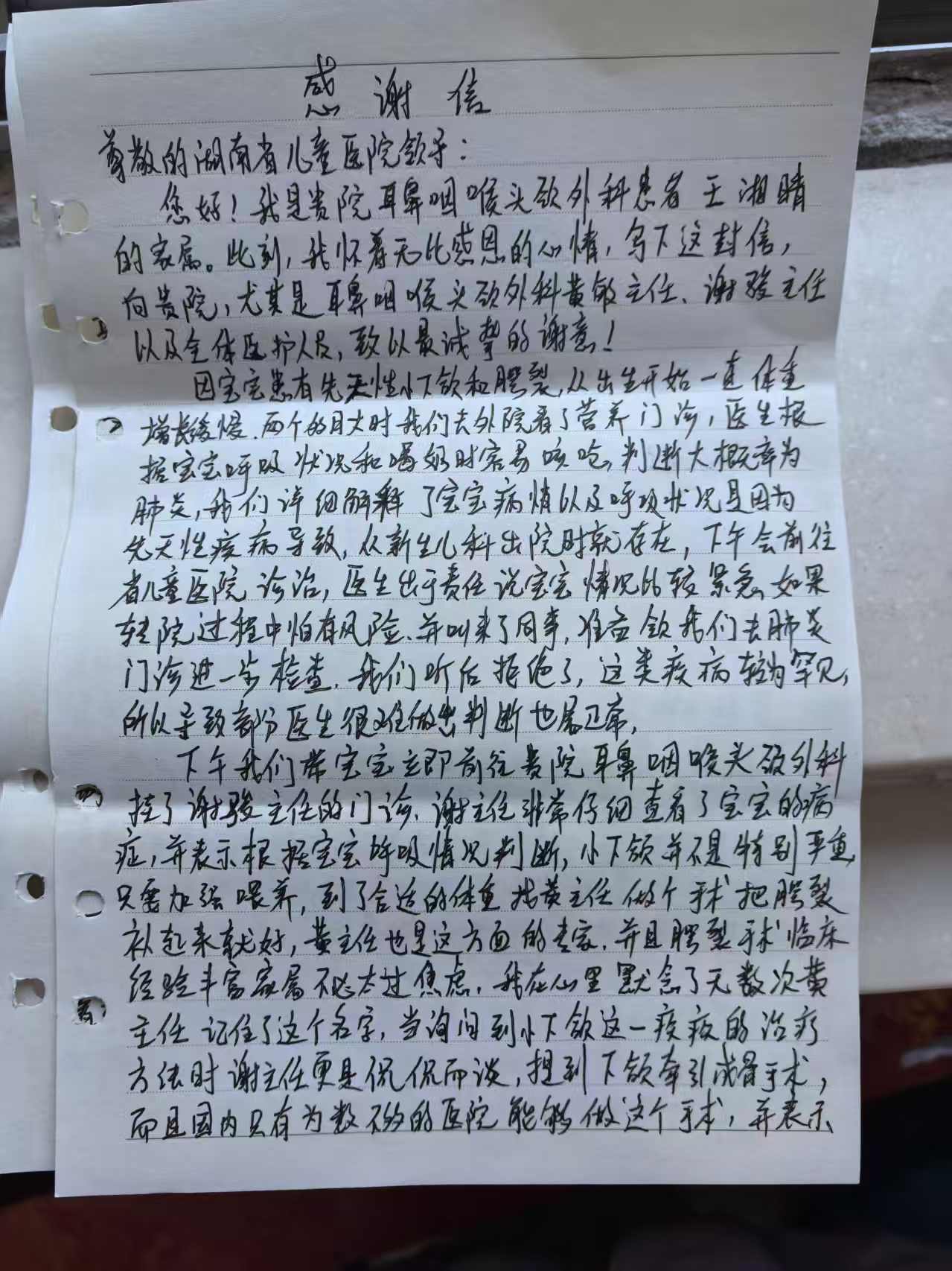 2月8日,湖南省儿童医院耳鼻咽喉头颈外科赵东吉慧医师看门诊,有一位家长拿着一面绣有“妙手仁心 医之楷模 医术精湛 深情永记”的锦旗和鲜花送给她,并递上一封有三页纸的感谢信。