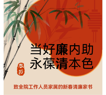 医院纪委以一封《当好廉内助 永葆清本色——致全院工作人员家属的廉洁家书》,向全院工作人员家属发出了廉洁倡议。倡导家属当好“廉内助”,常吹廉洁“枕边风”,共筑家庭廉洁防线,过一个廉洁、祥和、简朴的节日。
