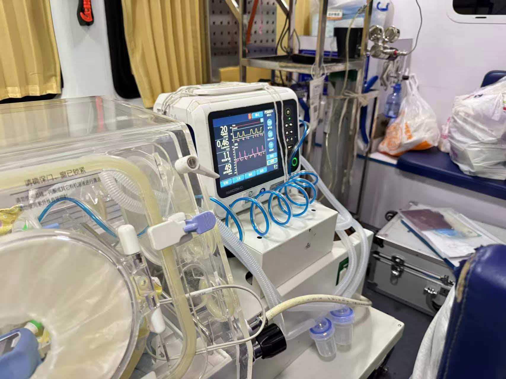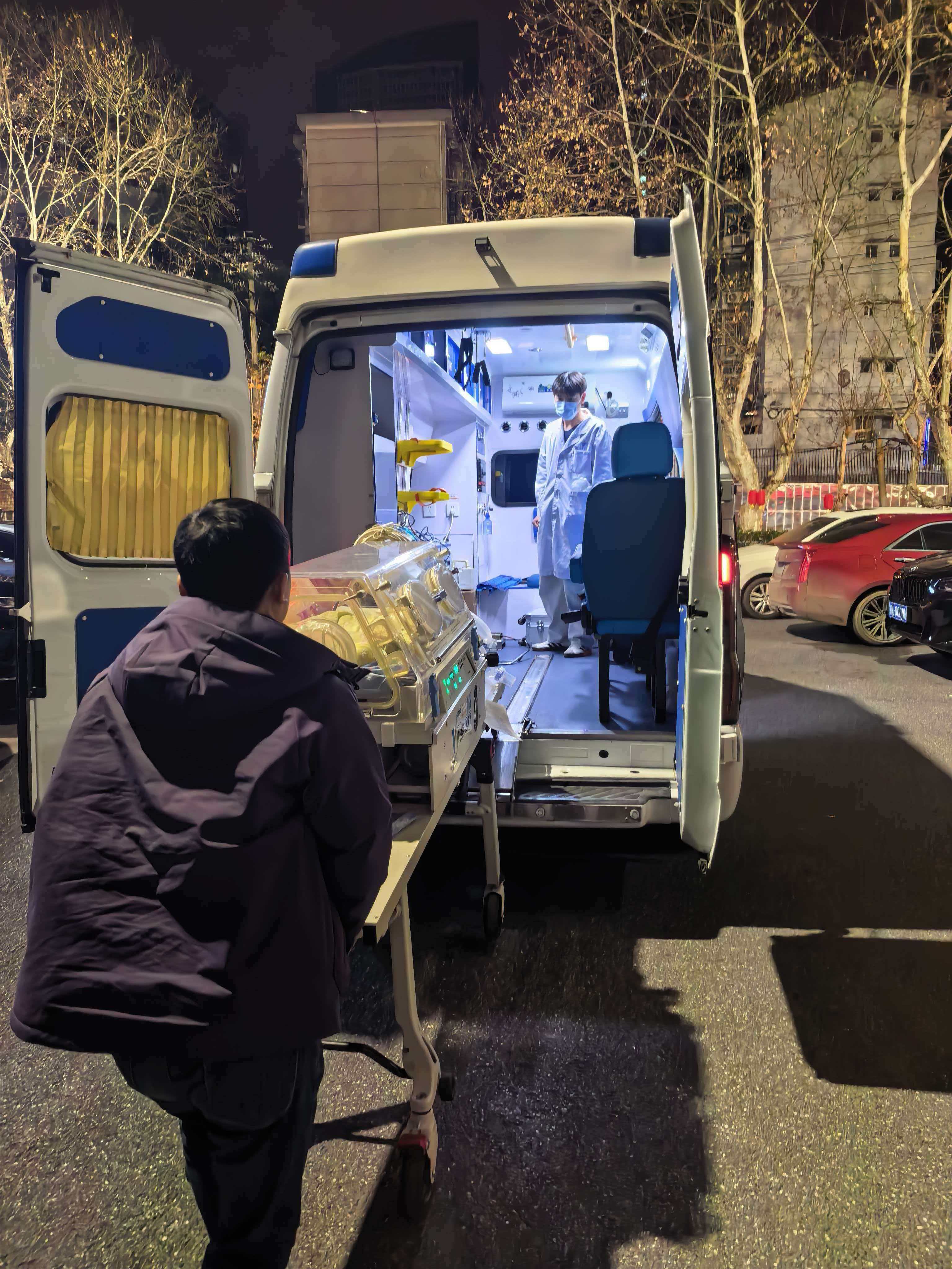 在这辞旧迎新的时刻院前转运中心的电话骤然响起,急促的铃声穿透了除夕的喧闹,打破了本应宁静的值守,“娄底市某医院紧急求助!一名出生仅1小时,孕25+6周早产儿,出生体重830g,重度呼吸窘迫,请求紧急转运”!接到电话的瞬间,转运团队的所有成员也闻声而动,医生、护士有条不紊的检查转运暖箱的控温系统,清点有创呼吸机、输液泵、监护仪等仪器设备,将急救药品按使用顺序整齐摆放。从接到电话到全员集结、装备到位、车辆启程,全程仅用了15分钟。这套堪称“移动新生儿ICU”的装备稳稳固定在车厢内,向着娄底方向疾驰而去。4小时40分钟后,团队终于把“巴掌宝宝”平稳转入NICU,看着监护仪上逐渐平稳的数值,所有人都松了一口气。