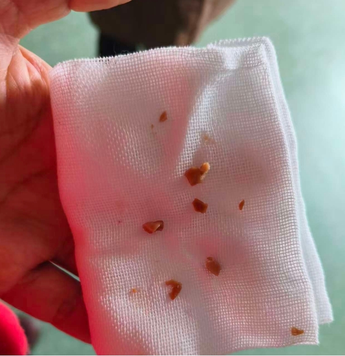 3月9日傍晚,家住浏阳的2岁5月女孩小月月,一边玩一边吃着花生,不一会儿,她嘴里塞满了咬碎了的花生,这时她由于口渴,找妈妈要水喝,接过水后,小月月咕噜咕噜的大口喝起来,突然她出现了剧烈咳嗽,满脸憋得通红。妈妈很快意识到孩子被花生呛着了,迅速使用海姆立克法进行急救,但花生还是没有出来。于是妈妈带她赶到当地市人民医院就诊,医院未行特殊处理,建议其转往湖南省儿童医院。我院耳鼻咽喉头颈外科值班医师根据其有明确异物吸入史,立即完善胸部CT检查,CT提示右主支气管异物,右肺阻塞性肺气肿。术前完善检查后,医生在急诊全麻下为患儿实施了支气管镜检+异物取出术,取出多块碎花生,大小不等,约0.2cmx0.3cmx0.3cm至0.3x0.4x0.4cm。