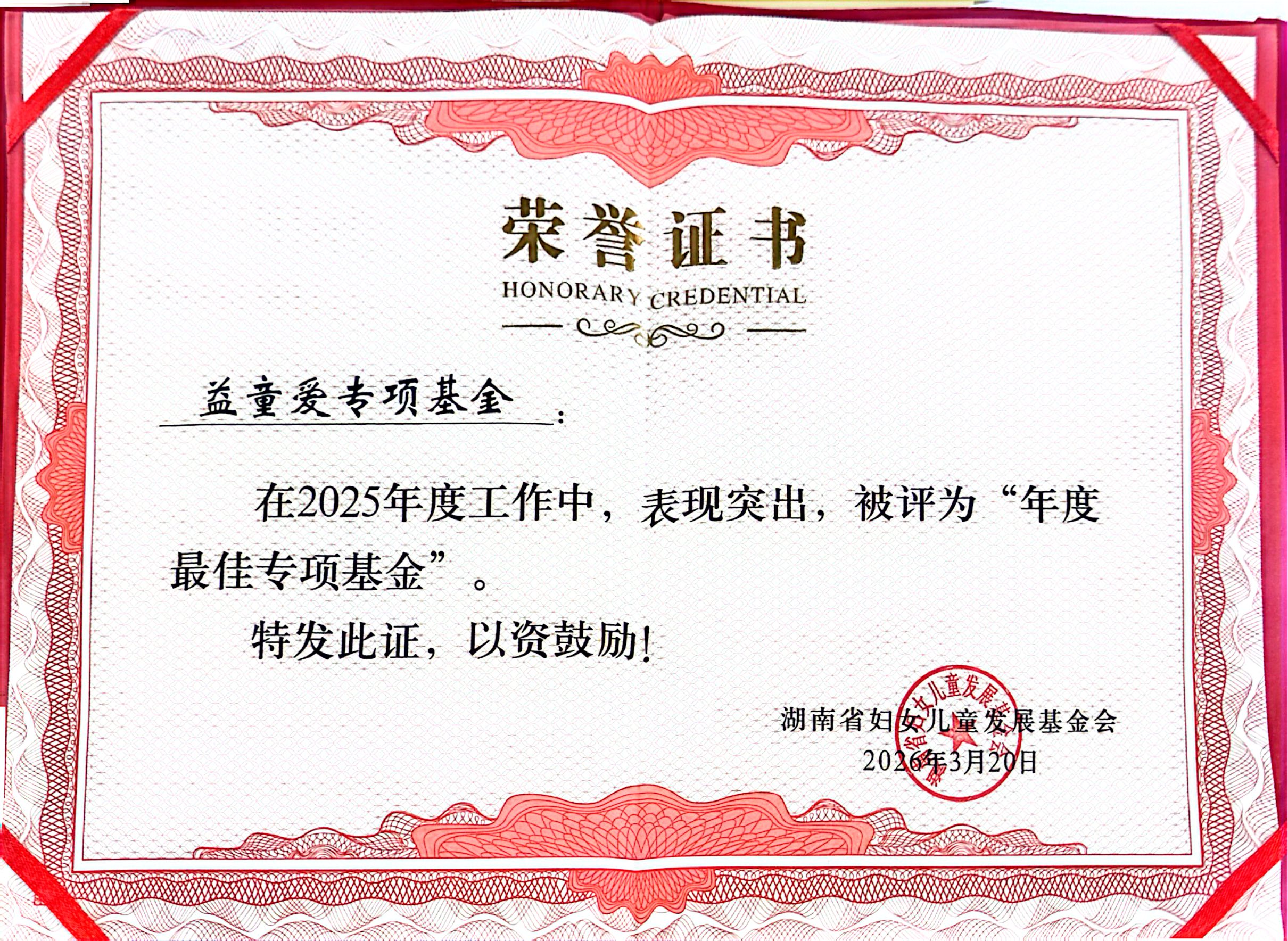 3月20日,湖南省妇女儿童发展基金会2025年度专项基金总结推进会顺利召开,省妇联副主席杨成英出席会议并发表讲话。会上,我院“益童爱”专项基金凭借优异的公益实践成效,获评“年度最佳”专项基金,彰显了我院在儿童公益医疗领域的责任与担当。