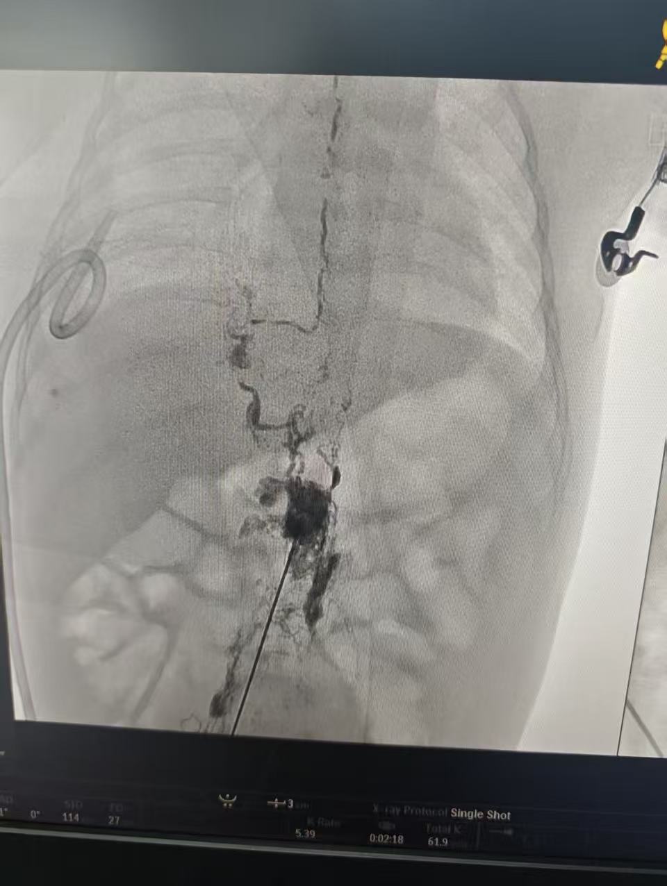 一切准备就绪后,小诺接受手术。血管介入科黄文雅主任团队在超声及影像引导下,经腹股沟淋巴管穿刺,注入造影剂清晰显示胸导管走行及漏口。面对比发丝还纤细的淋巴管,手术团队凭借精湛技艺,将封堵剂精准注入漏口,既彻底阻断乳糜液异常渗漏,又最大程度保留正常淋巴循环。术中麻醉手术科团队针对 2月婴儿的生理特点,制定精细化麻醉方案,精准调控麻醉深度。手术全程历时数小时,精准完成淋巴管造影与瘘口封堵。目前,小诺术后恢复良好,乳糜液引流量已显著减少,呼吸顺畅,营养吸收逐步改善,正在接受后续康复护理,即将顺利出院。