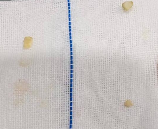 我院耳鼻咽喉头颈外科值班医生在急诊全麻下为患儿实施了支气管镜检+异物取出术。医生在术中发现患儿左侧支气管腔内充满大量脓性分泌物,吸尽分泌物后异物显露,医生迅速将异物钳出,原来是一块大小约0.3cm×0.4cm×0.4cm的碎葵瓜子仁!异物取出后,齐齐的咳嗽、喘息症状很快得到了缓解。