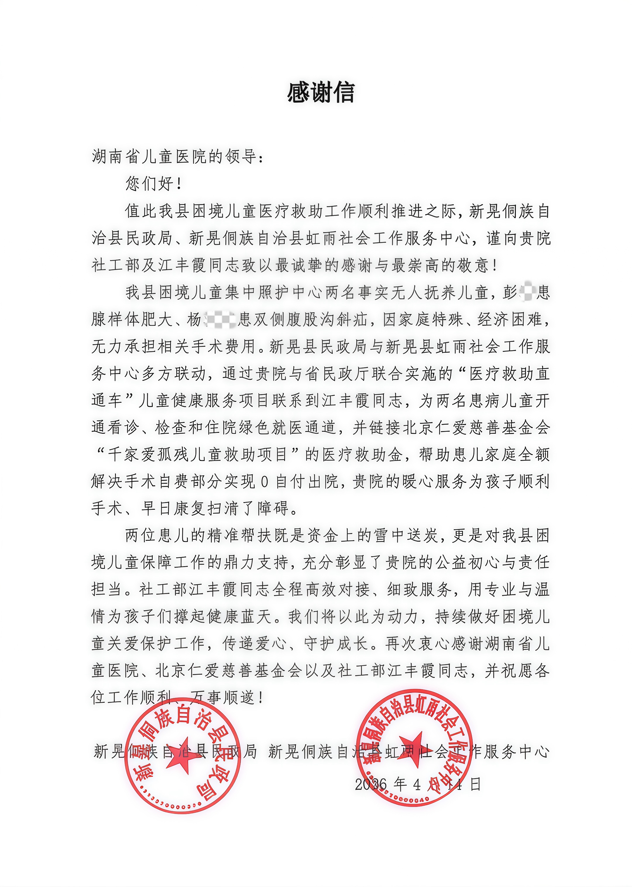 “感谢湖南省儿童医院及社工部江丰霞同志,为两名患病儿童开通绿色就医通道,并链接慈善救助金,帮助实现0自付出院……”近日,一封满载深情的感谢信从新晃侗族自治县寄到了湖南省儿童医院。信中,两名事实无人抚养儿童——洋洋和翔翔,在“医疗救助直通车”项目的帮助下顺利手术、康复出院的故事,令人动容。