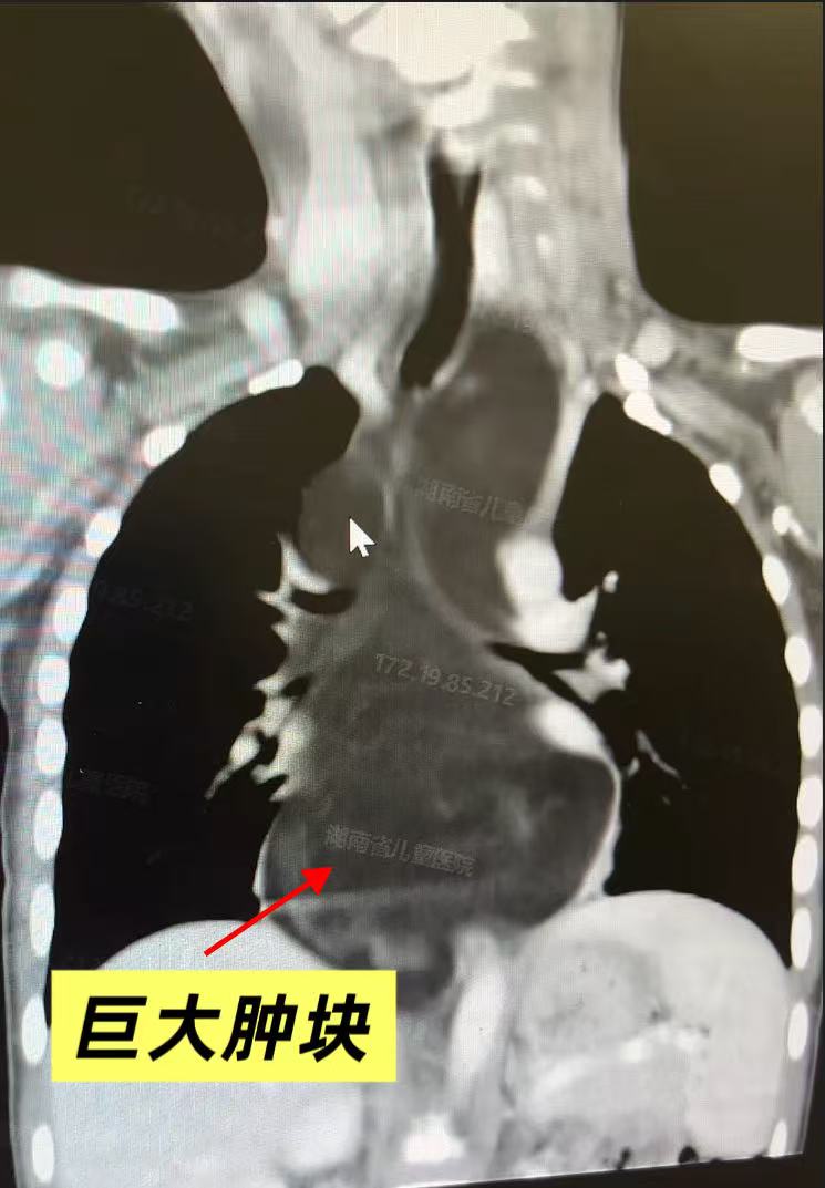 约十天前,小宇因受凉后反复低烧,在当地医院检查时,胸部CT发现右侧纵隔内有一巨大肿物,当地医院评估手术风险极高,建议转诊上级医院,一家人紧急来到湖南省儿童医院心胸外科门诊就诊,“门诊一看片子,我们心里就有数了,这东西不小,而且位置很深。”心脏中心一病区主任医师阳广贤回忆道,“纵隔是胸腔内心脏、大血管、气管、食管等重要器官的“集中地”,这个地方一旦长东西,不管良性恶性,都像在“心脏门口堆家具”——不是什么好事。”但这个直径约 15厘米的巨大肿物,呈分叶状,已经在他小小的胸腔里“扎根””,紧紧包裹着奇静脉弓、向后压迫食管、迷走神经,向前压迫气管及心脏,向下延伸至膈肌水平,部分侵入了左侧纵隔深处、主动脉后方,随时可能压迫加重导致窒息、手术刻不容缓.