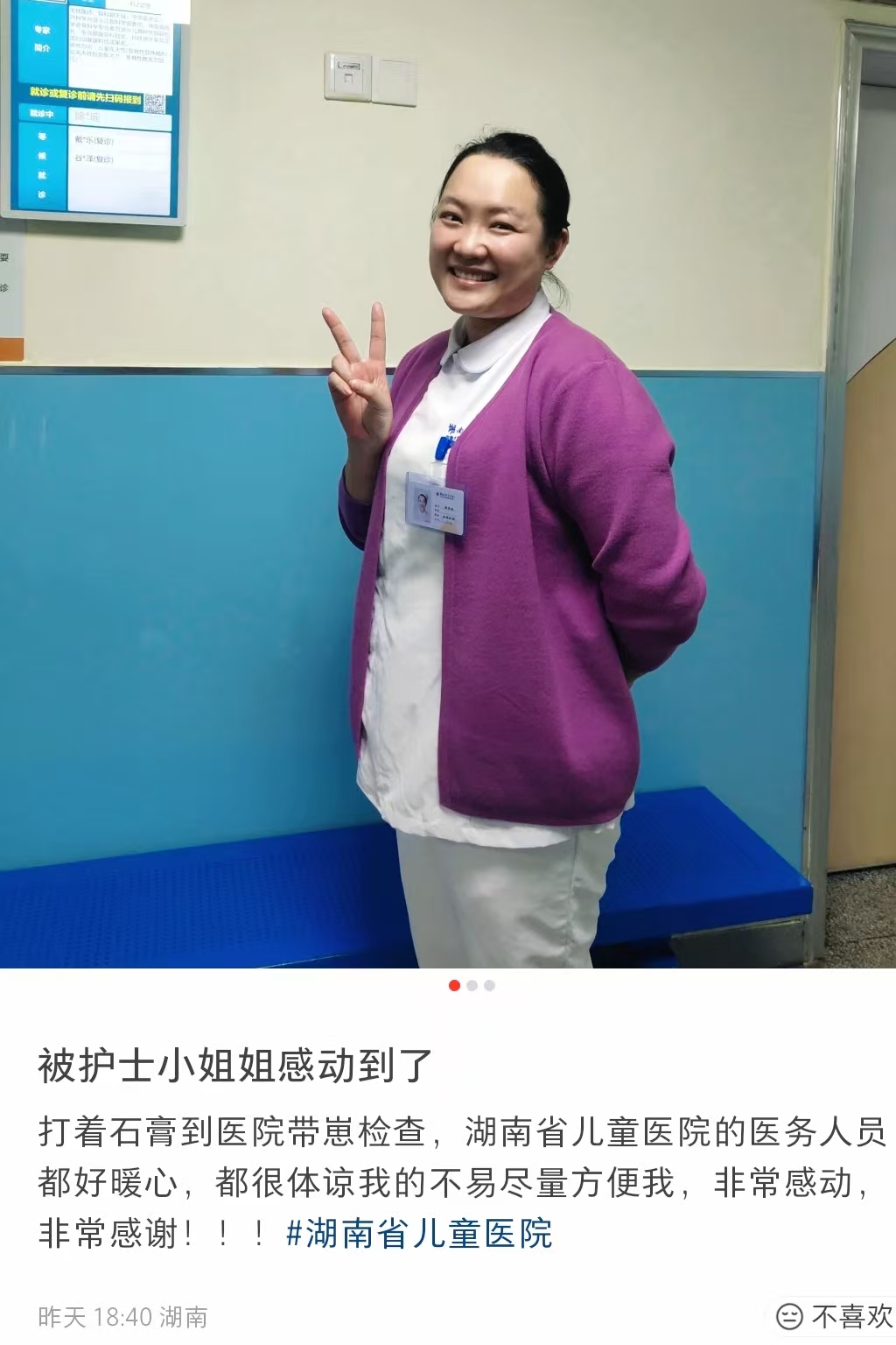 近日,门诊三楼外科分诊台前,分诊护士席荣敏在分诊间隙,留意到人群中一位行动不便的母亲。她腿部打着石膏,拄着拐杖,步履艰难,还要照看身边五六岁的女儿。同为母亲的席荣敏深知独自带娃就医的不便,她立刻上前帮忙搀扶,为其找寻就近的座位,同时轻声交谈了解情况。得知这位母亲是一位军嫂,他的丈夫在保家卫国,而她自己腿部骨折受伤,只能独自带着孩子前来就医,这份坚强与付出,让席荣敏满心敬佩。席荣敏在做好手头分诊本职工作的同时,始终留心着这对母女的状况,利用工作间隙及时提醒她们候诊序号,耐心解答就诊相关的疑问,全程给予力所能及的帮扶。当临近傍晚,席荣敏看到小女孩坐立不安,询问得知是小孩饿了但外卖因天气恶劣和晚高峰配送延迟时,她拿出自己的面包赠予孩子。看诊结束后时间已经将近19点,席荣敏处理好手头工作,主动上前帮助并护送她们离开。一路上,她细心叮嘱雨天路滑、脚下小心,看着母女俩安全离开,才放下心来。这份平凡又朴实的帮助,深深打动了这位军嫂。事后,她特意在小红书发布表扬笔记,字里行间满是对席荣敏贴心举动的感谢。