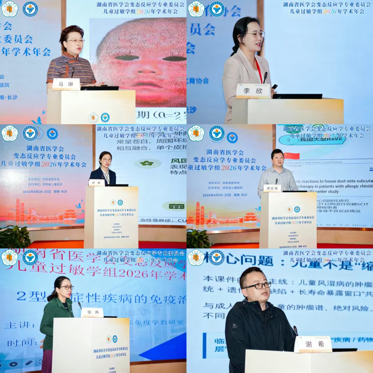 为进一步推动湖南省儿童过敏性疾病诊疗规范化、同质化发展,由湖南省医学会变态反应学专业委员会主办、湖南省儿童医院皮肤科牵头承办的儿童过敏学组2026年学术年会,于4月25日在长沙顺利召开。大会汇聚省内外皮肤、过敏、呼吸、免疫、营养等多领域权威专家及骨干医师,聚焦过敏、免疫性疾病前沿进展、临床难点与规范诊疗开展深度交流。