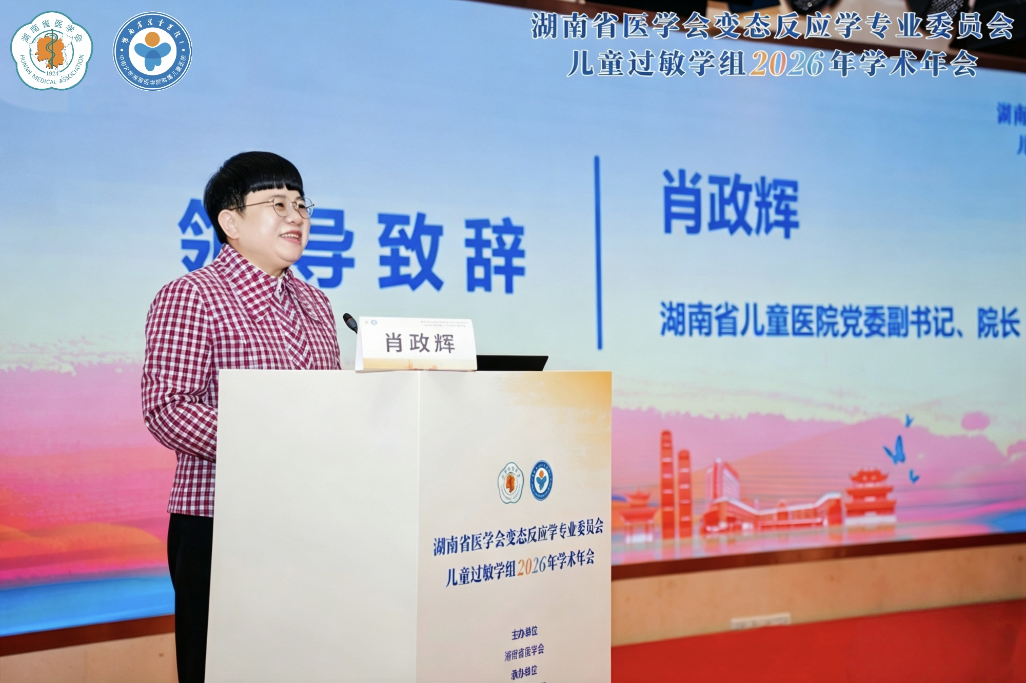 我院党委副书记、院长肖政辉出席开幕式并致辞。她代表医院向莅临大会的各位专家、同仁致以热烈欢迎,向长期以来关心支持医院及过敏学科发展的社会各界、行业同仁表示诚挚感谢。肖政辉强调,儿童健康是全民健康的重要基石,儿童过敏性疾病作为儿科高发慢性疾病,已成为当前儿科医疗领域重点关注的公共卫生问题。医院始终坚守“以患儿为中心”的办院初心,全力支持皮肤科深耕儿童过敏性疾病诊疗领域,经过多年深耕细作,科室已发展成为中南地区儿童皮肤病诊疗核心力量,在专科建设、临床诊疗、学术科研、人才培养等方面均取得长足进步。她表示,本次大会搭建起跨区域、跨学科的高水平学术交流桥梁,希望全体参会人员学有所获、研有所得,共同推动全省过敏性疾病诊疗水平提质升级;也期待与各位专家同仁深化合作、携手共进,全力守护三湘儿童健康,助力健康中国、健康湖南建设迈向新台阶。