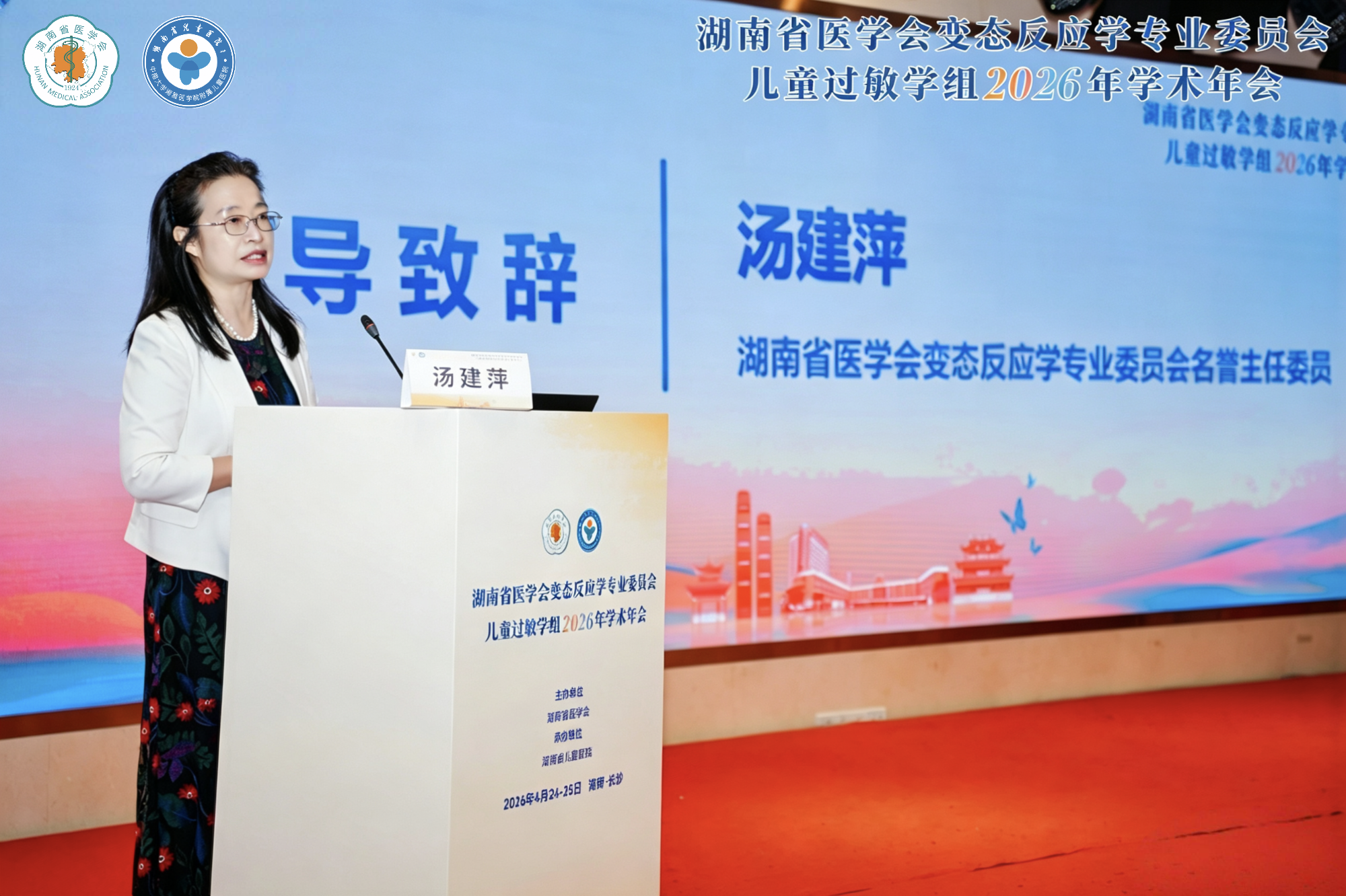 湖南省医学会变态反应学专业委员会名誉主任委员汤建萍教授在致辞中,对大会顺利召开表示祝贺,对省医学会及我院皮肤科的精心组织、高效筹备表示感谢。她表示,儿童过敏学组成立以来,始终以规范诊疗、学术推广、人才培养为核心工作,稳步推动全省儿童变态反应学科持续向好发展。希望以本次年会为契机,进一步凝聚学科发展合力、强化多学科协作联动、推广先进适宜诊疗技术,持续提升全省儿童过敏性疾病整体防治能力,为三湘儿童健康保驾护航。
