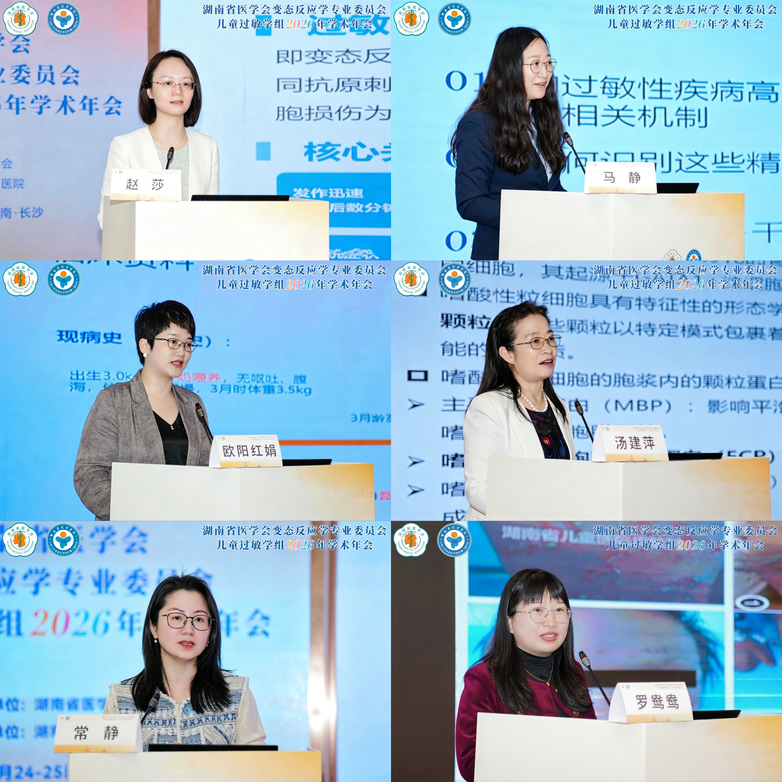 紧接着在我院吴天慧教授、岳阳市中医医院雷东方教授、岳阳市中心医院黄辉云教授的依次主持下,学术分享节奏紧凑、内容扎实。我院多位专家、骨干在大会上作专题分享,充分展示科室专业实力。赵莎教授围绕过敏儿童预防接种进行规范解读;马静教授从身心共护视角分享过敏性疾病与儿童心理行为问题的关联与干预;汤建萍教授介绍嗜酸性粒细胞阳离子蛋白ECP测定的临床应用;韦祝教授分享HMO母乳低聚糖在牛奶蛋白过敏管理中的实践;常静教授介绍了临床常见伴有瘙痒的皮肤病及其治疗;欧阳红娟教授聚焦婴幼儿牛奶蛋白过敏全程管理;罗鸯鸯教授分享湿疹样皮炎相关免疫缺陷病鉴别经验。内容紧贴临床、实用性强,获得与会人员高度认可。