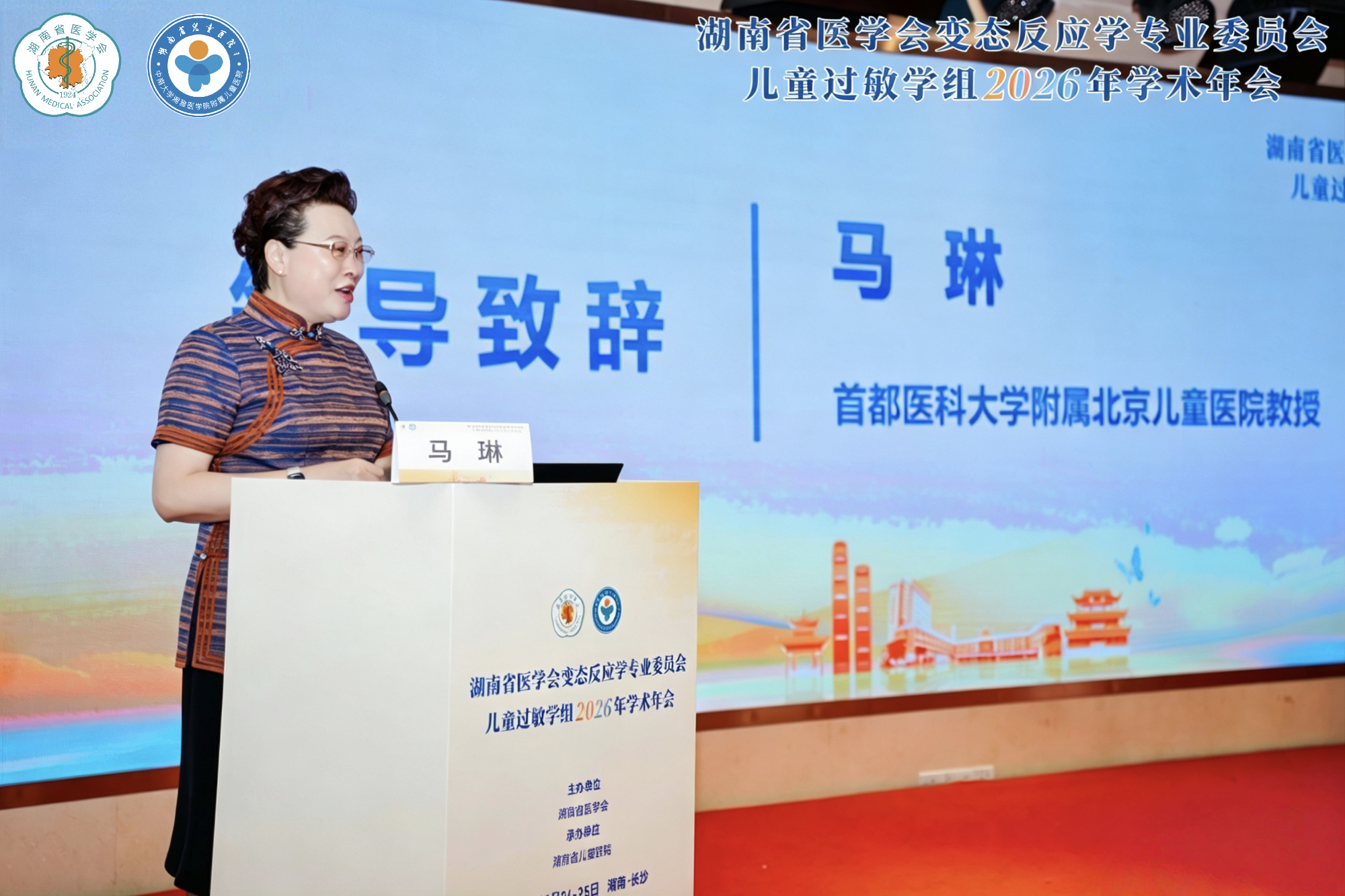 首都医科大学附属北京儿童医院马琳教授现场致辞,对大会顺利召开表示热烈祝贺,高度认可我院皮肤科在儿童过敏性疾病诊疗、学科建设、基层推广等方面作出的突出贡献。马琳指出,儿童过敏诊疗需始终坚持规范化、全程化、多学科协同的发展方向,湖南省在儿童特应性皮炎、食物过敏等疾病的规范化诊治与基层普及工作中成果显著,为全国儿童过敏性疾病防治工作提供了宝贵实践经验。她表示,儿童皮肤学科使命重大、发展前景广阔,愿与湖南儿科医疗同仁深化学术协作、共解临床难题,携手推动全国儿童过敏诊疗事业高质量发展,同时寄语我院皮肤科稳步迈进国家重点学科行列,实现学科发展新突破。